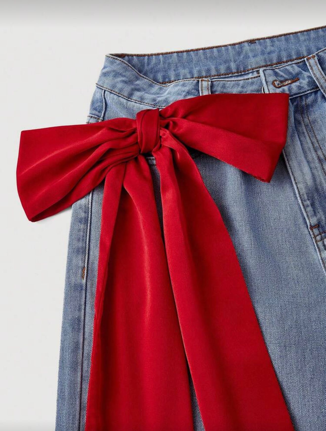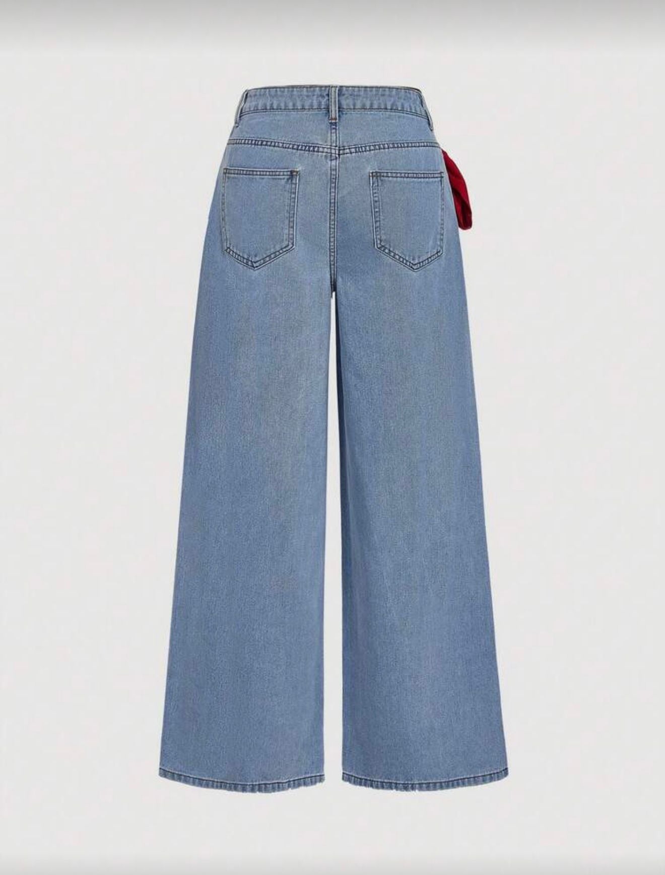 Blugi wide-leg cu talie înaltă, din denim albastru, accentuați de o panglică roșie statement în talie. Un mix modern de confort și feminitate, ideal pentru ținute casual cu personalitate.