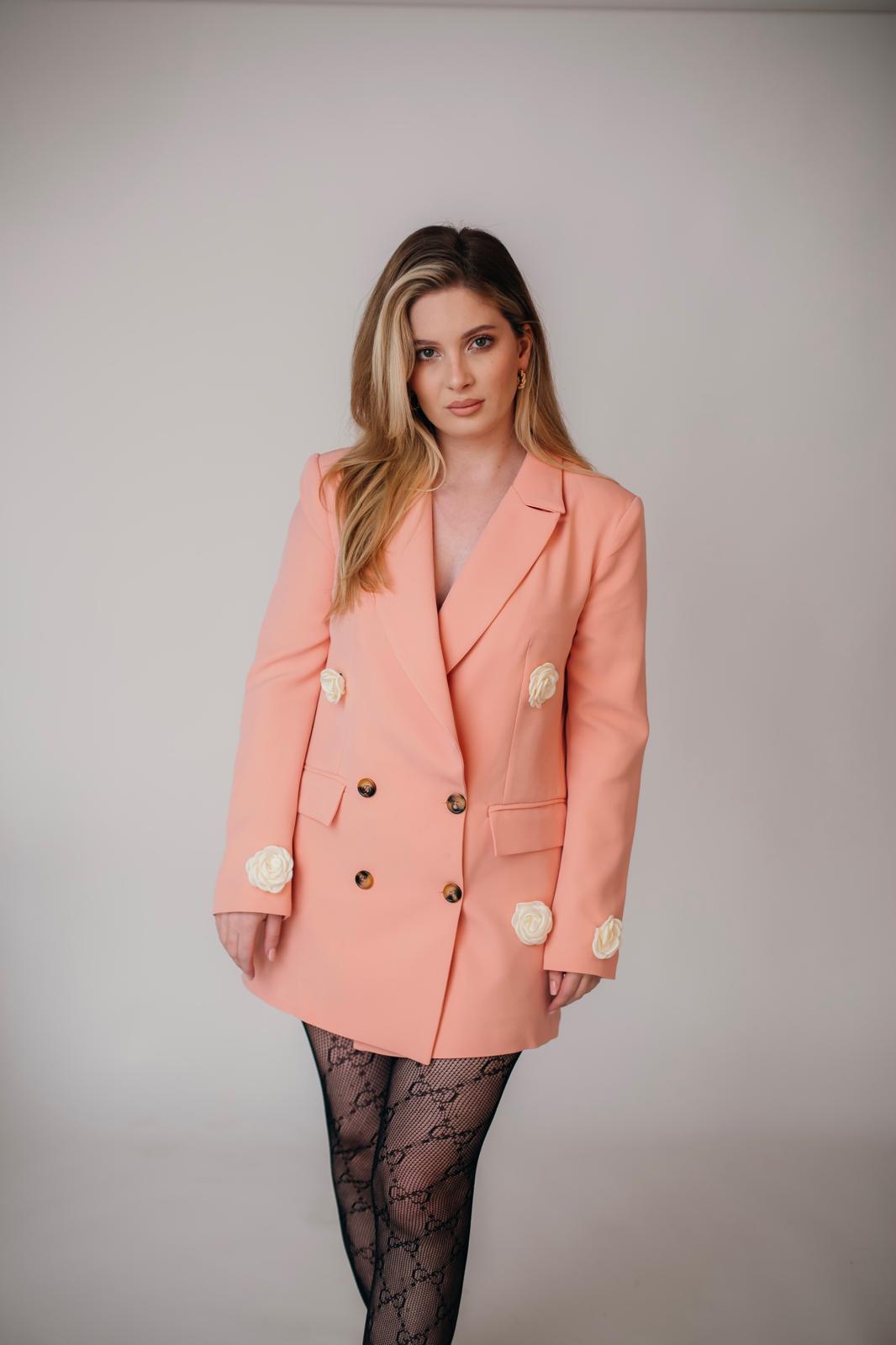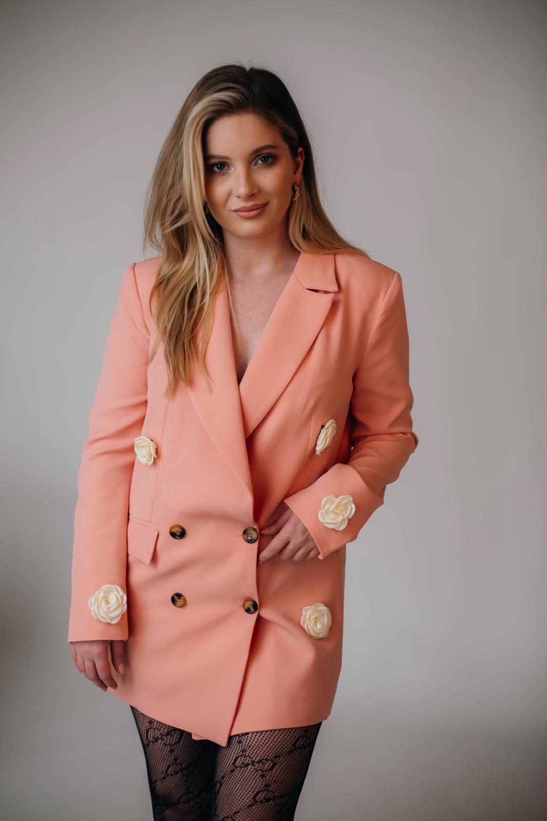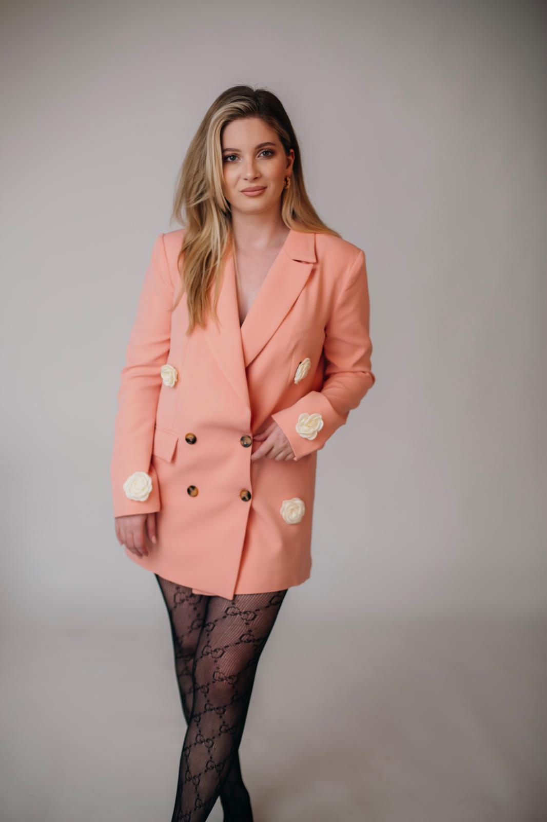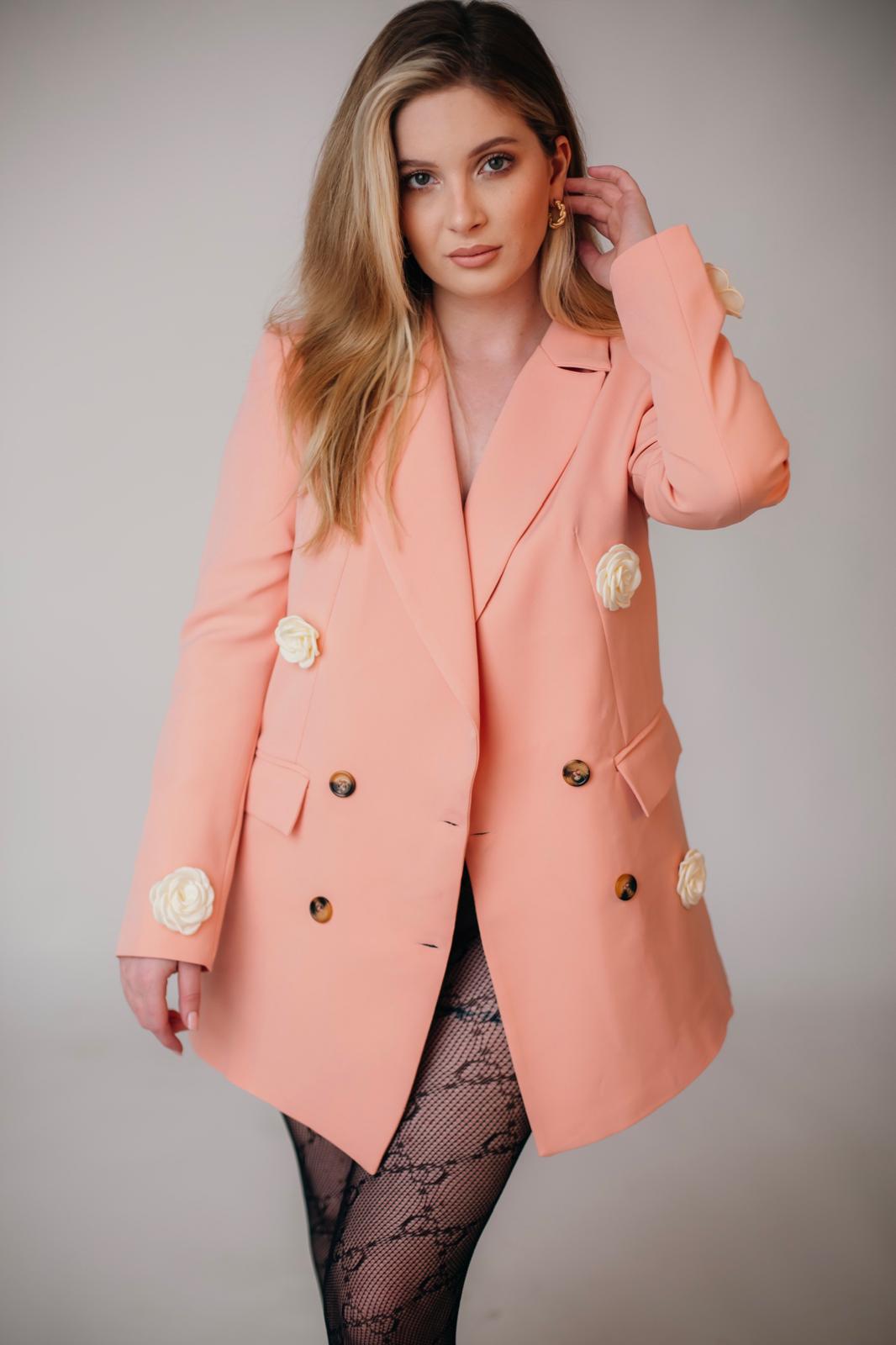 Sacou elegant, cu o croială modernă și feminină, ideal pentru ocazii speciale sau ținute office. Fabricat dintr-un material premium, se așază frumos pe corp și oferă un plus de rafinament oricărei apariții. Se închide cu nasturi discreti și poate fi ușor asortat cu fuste sau pantaloni eleganți.