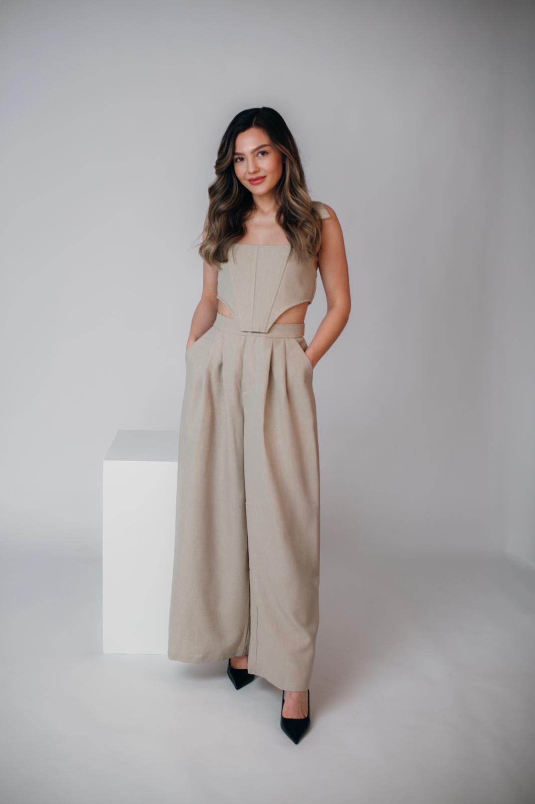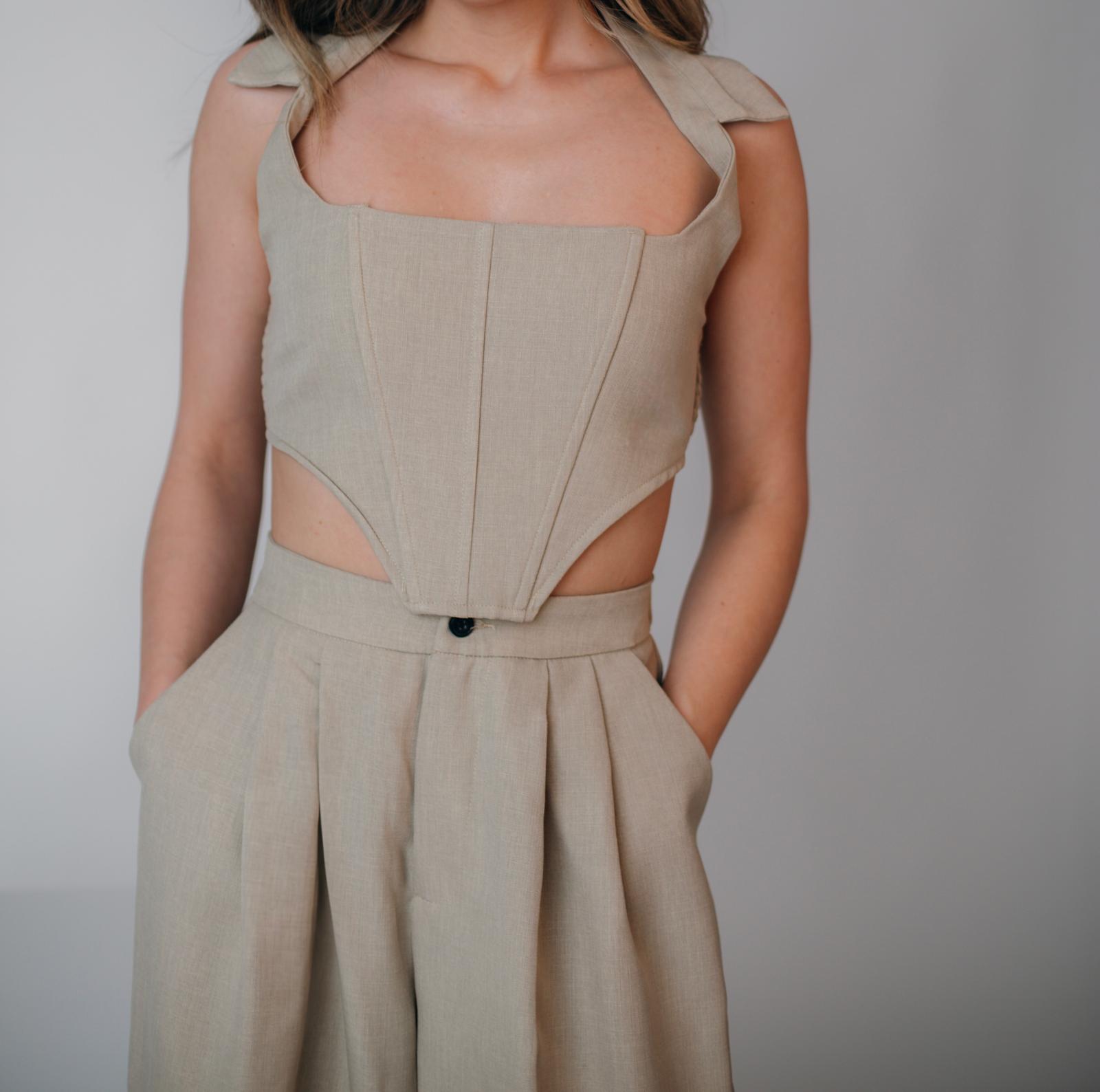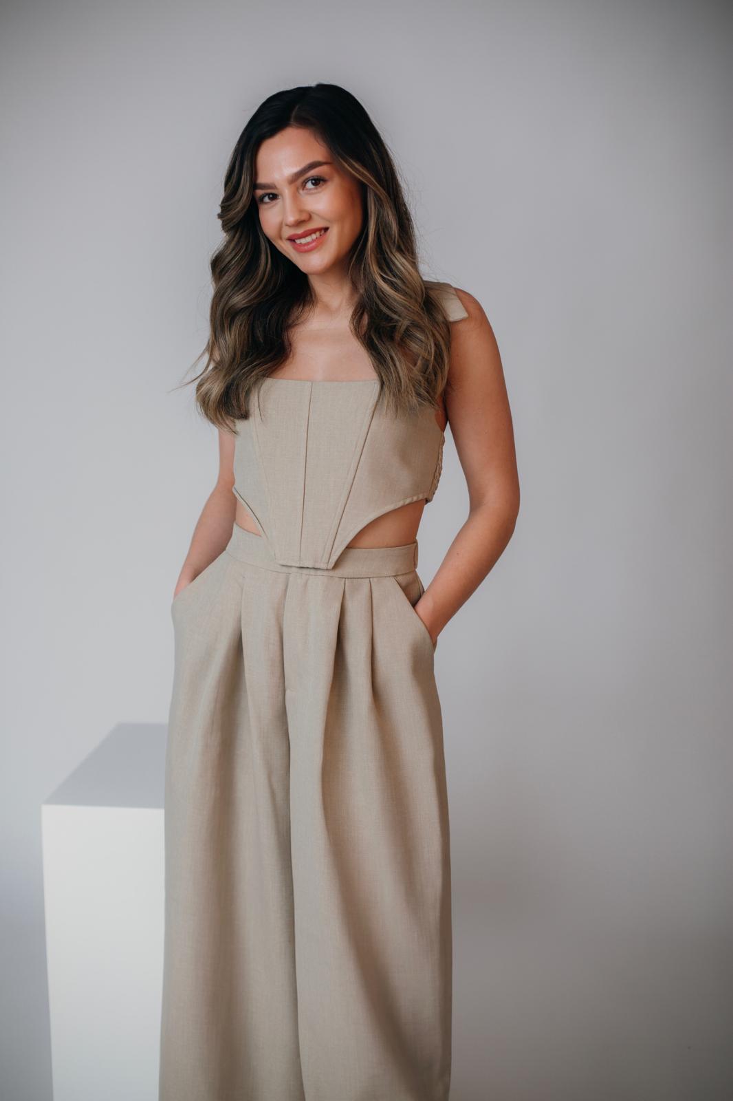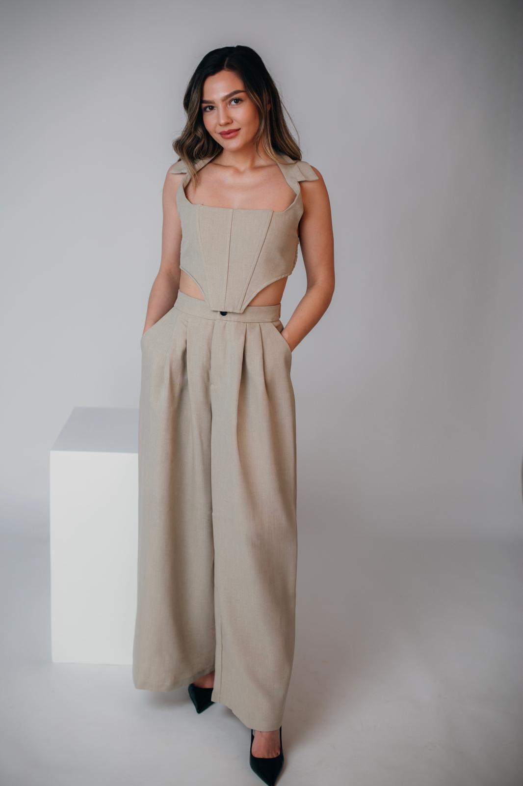 Compleu elegant, ideal pentru ocazii speciale, birou sau evenimente formale. Sacoul tip vesta are o croială feminină, ce evidențiază silueta, iar pantalonul completează perfect ținuta printr-un design clasic și rafinat. Fabricat dintr-un material de calitate, ușor și plăcut la purtare, acest compleu oferă un look sofisticat, dar confortabil.