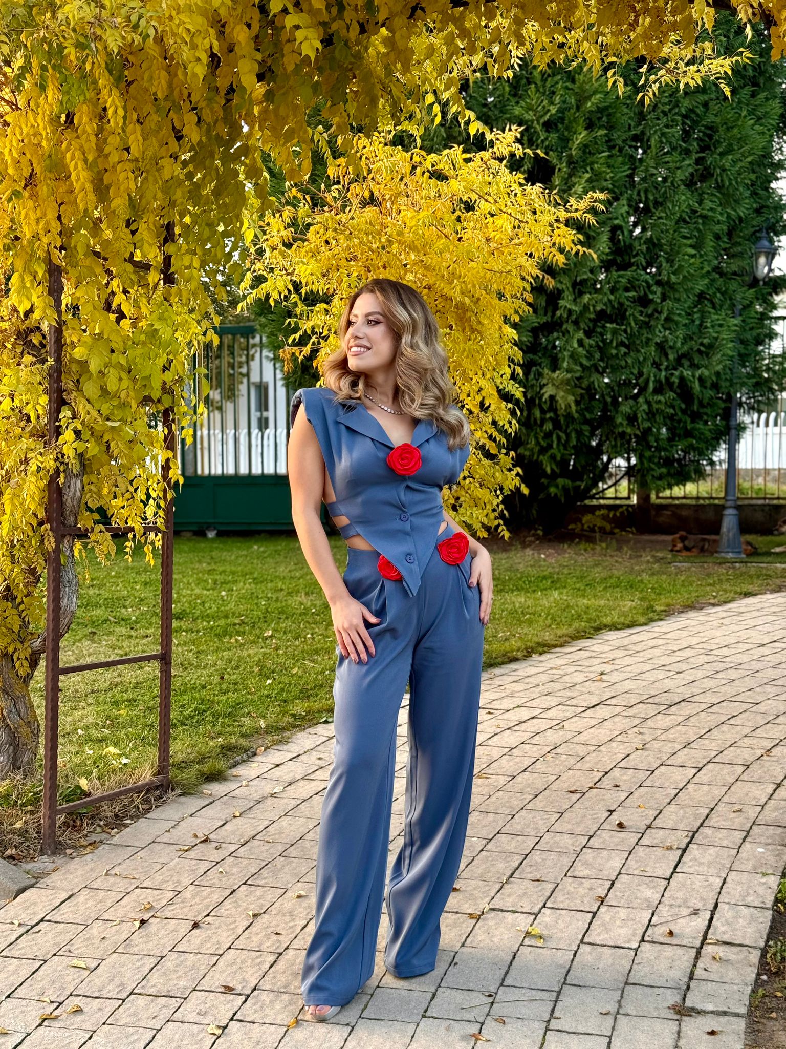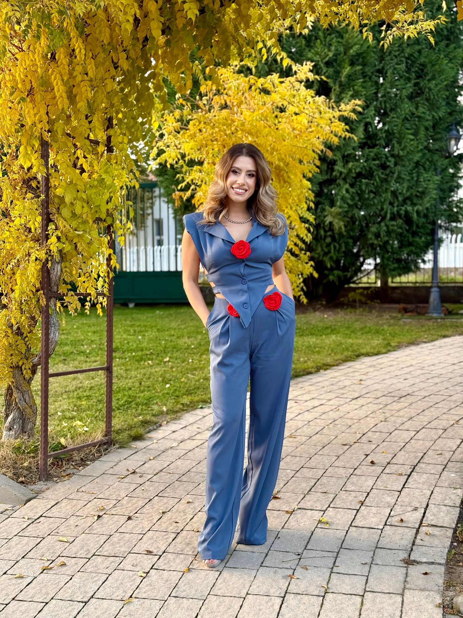 Compleu elegant, ideal pentru ocazii speciale, birou sau evenimente formale. Sacoul tip vesta are o croială feminină, ce evidențiază silueta, iar pantalonul completează perfect ținuta printr-un design clasic și rafinat. Fabricat dintr-un material de calitate, ușor și plăcut la purtare, acest compleu oferă un look sofisticat, dar confortabil.