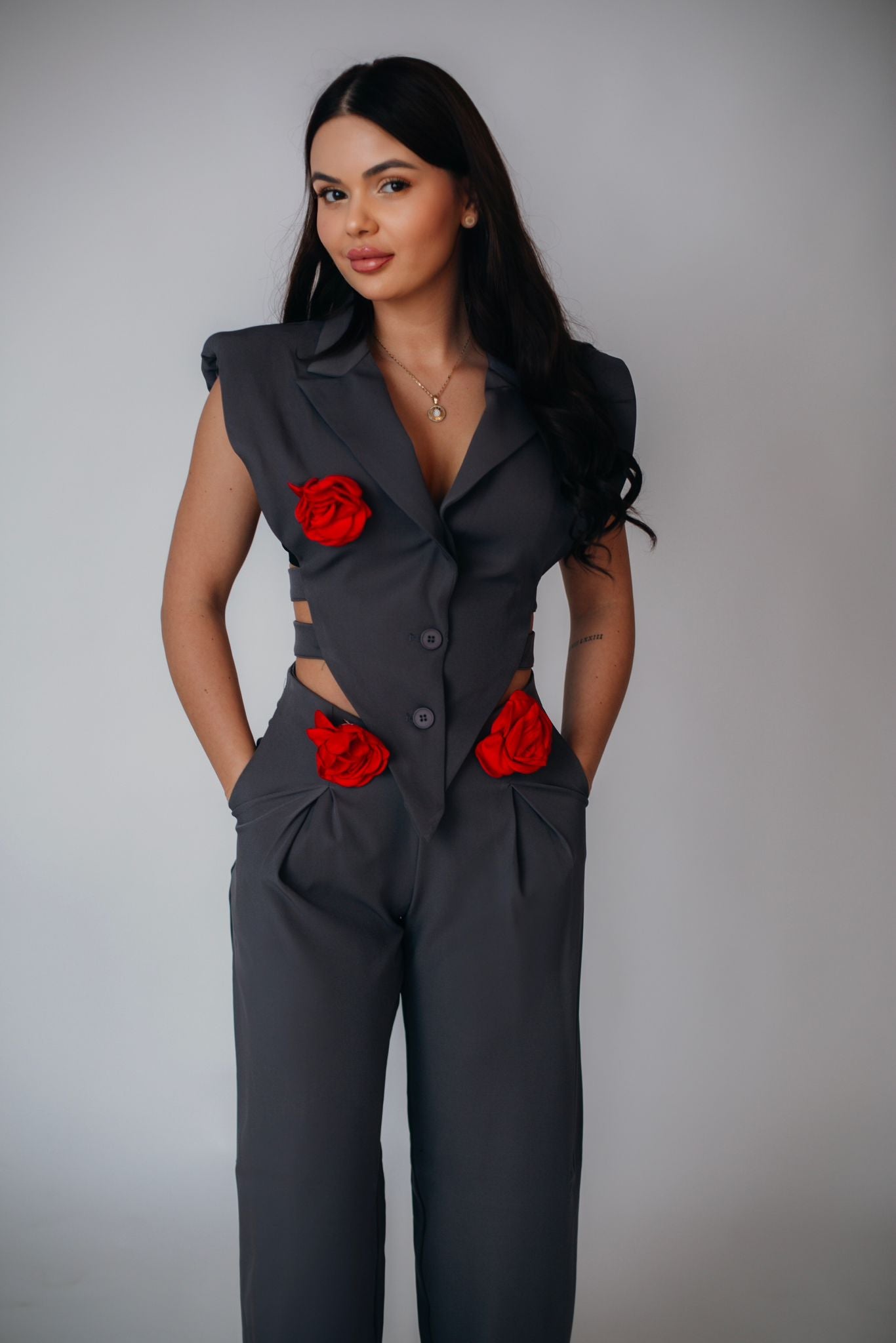 Compleu elegant, ideal pentru ocazii speciale, birou sau evenimente formale. Sacoul tip vesta are o croială feminină, ce evidențiază silueta, iar pantalonul completează perfect ținuta printr-un design clasic și rafinat. Fabricat dintr-un material de calitate, ușor și plăcut la purtare, acest compleu oferă un look sofisticat, dar confortabil.