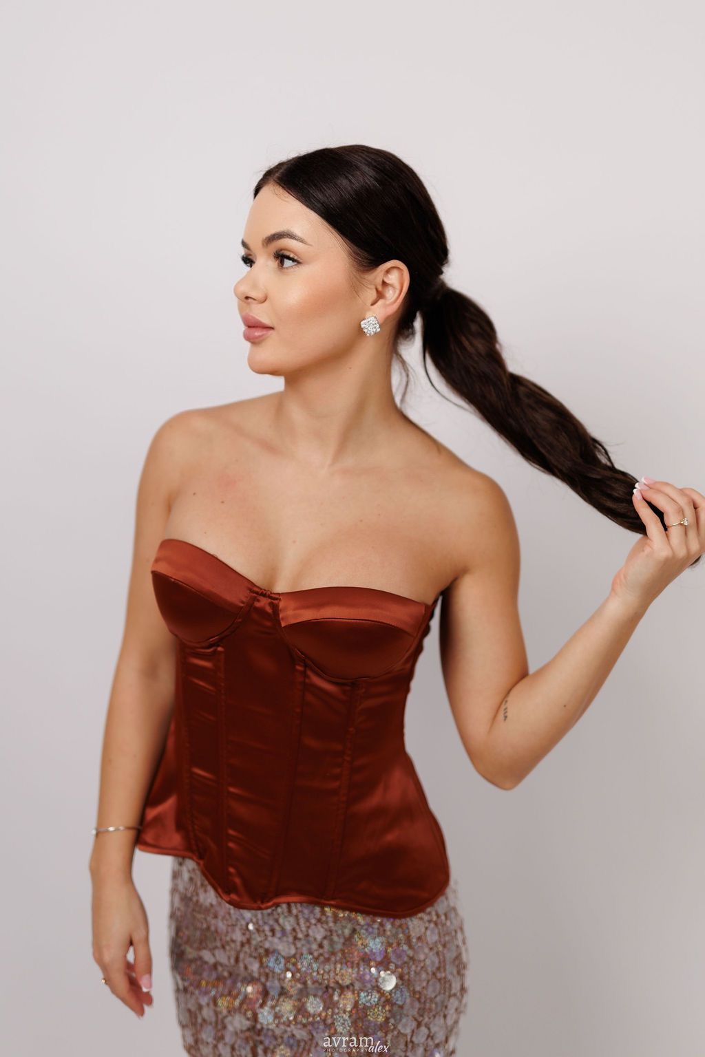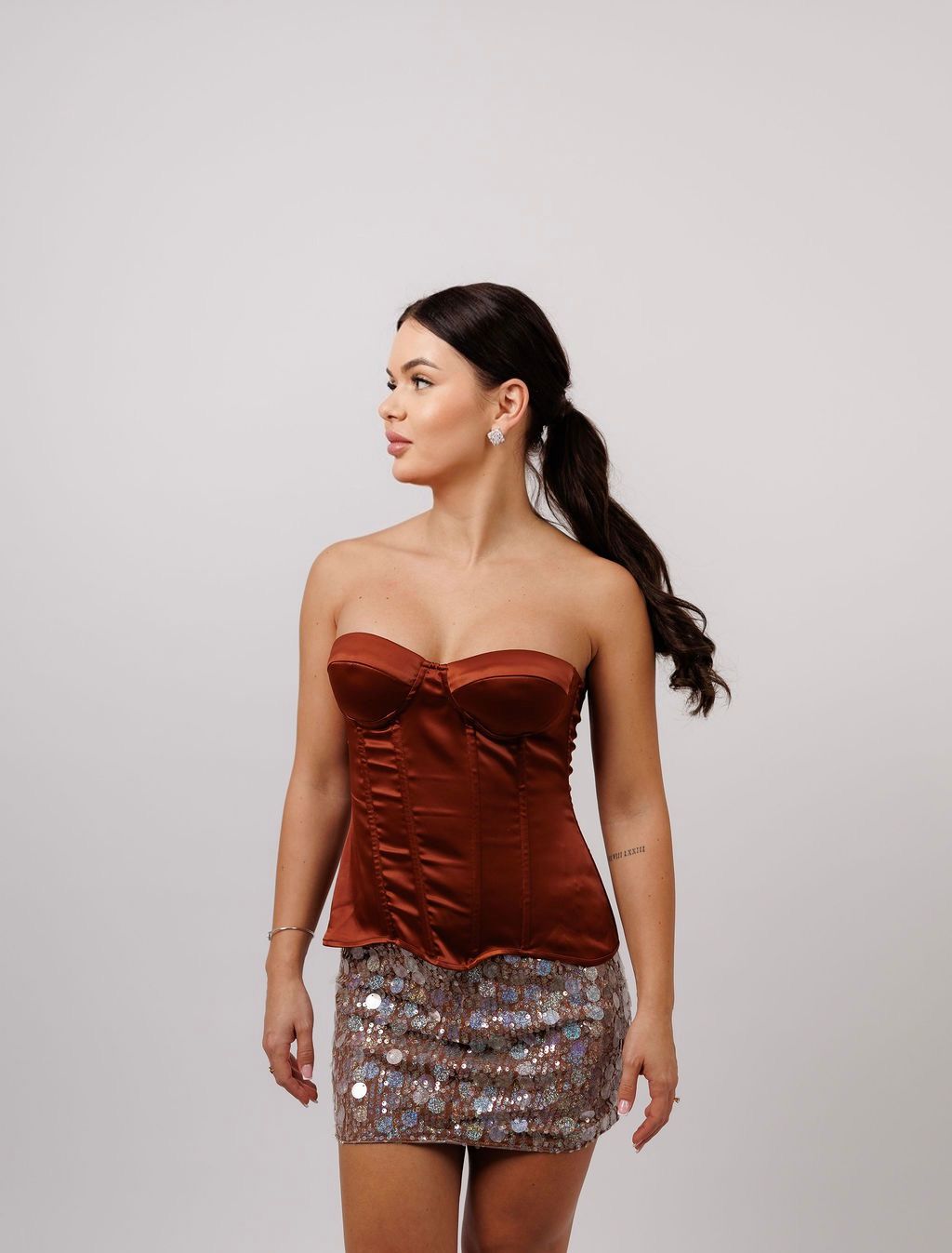 Un set spectaculos, compus dintr-un corset feminin și o fustă strălucitoare cu paiete, creat pentru a evidenția grația și încrederea purtătoarei. Corsetul are o structură bine definită, care modelează delicat talia și accentuează linia bustului, fiind realizat dintr-un material fin și ușor satinat ce adaugă un plus de eleganță. În partea de jos, fusta cu paiete captează lumina la fiecare mișcare, oferind un efect glamour remarcabil. Șlițul lateral (fusta „picioasă”) adaugă o notă seducătoare, alungind vizual silueta și conferind libertate de mișcare. Împreună, cele două piese creează un look sofisticat, ideal pentru evenimente speciale, petreceri sau seri în care eleganța și strălucirea sunt esențiale.